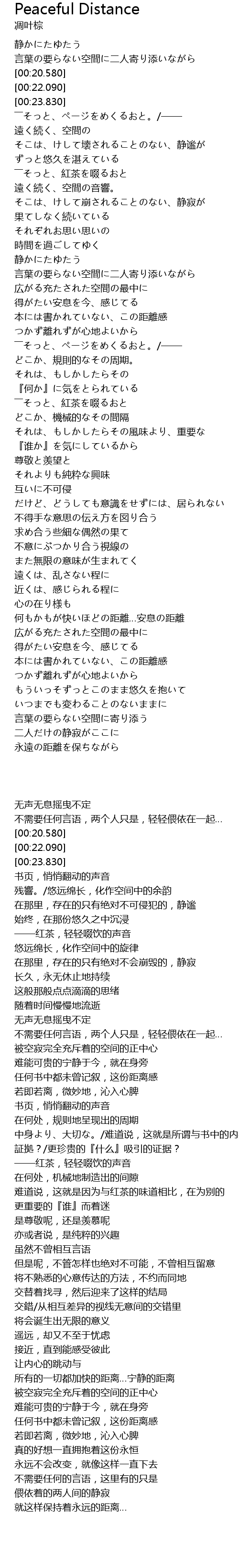| [04:46.910] | 何もかもが快いほどの距離…安息の距離 |