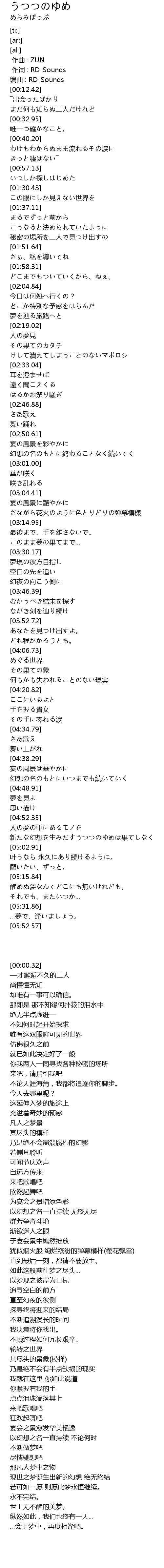 | [04:55.85] | 新たな幻想を生みだすうつつのゆめは果てしなく |