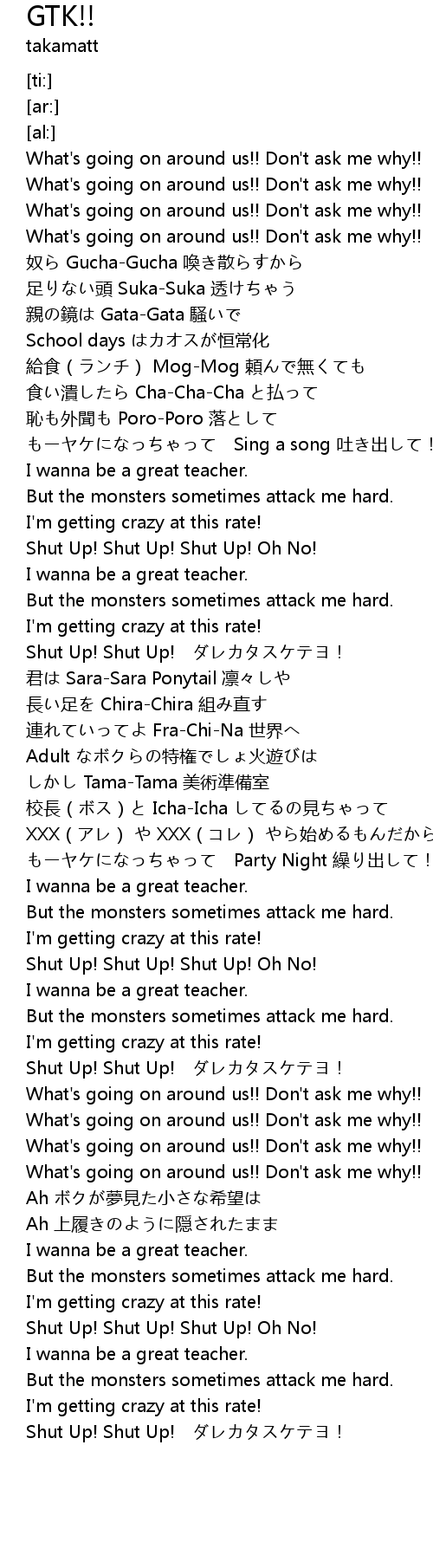 | [03:43.43] | Shut Up! Shut Up! Shut Up! Oh No! |