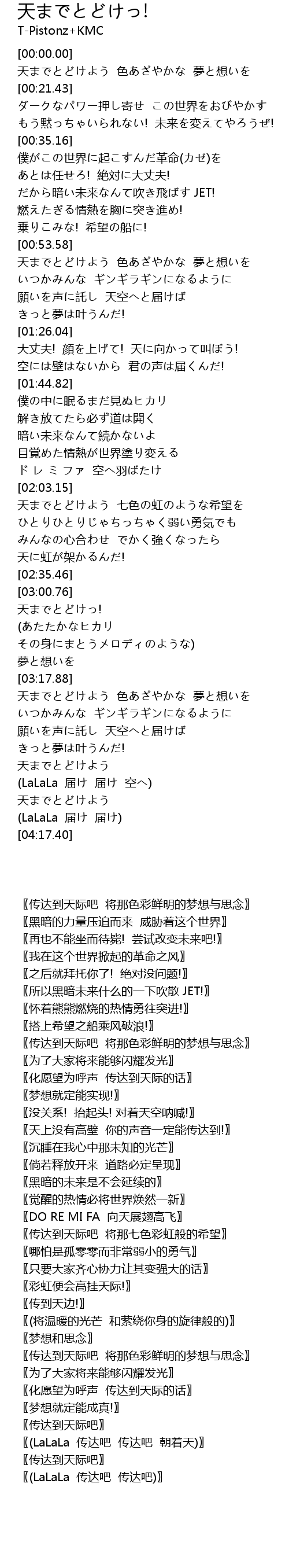 | [00:03.75] | 天までとどけよう 色あざやかな 夢と想いを |