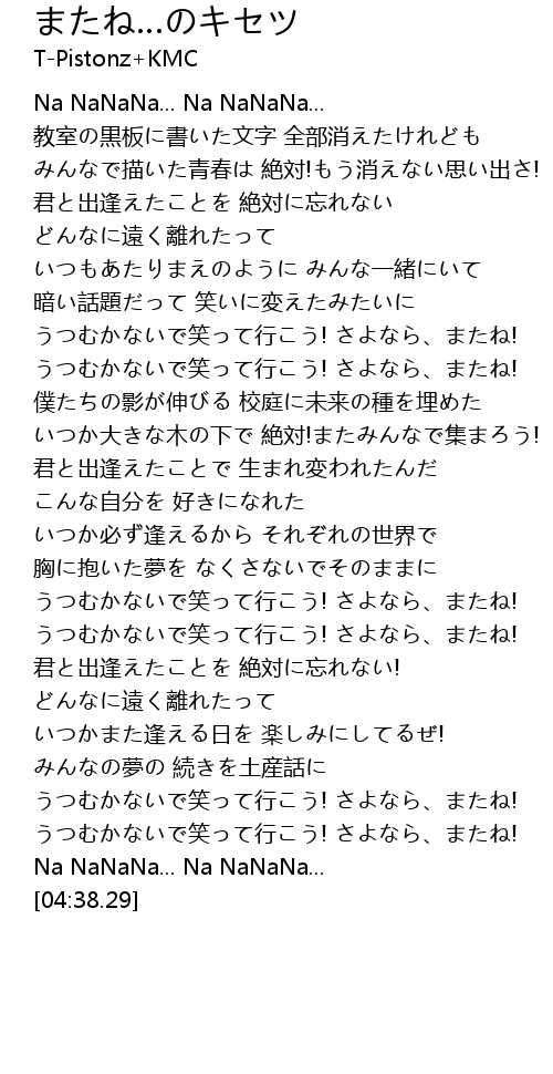 | [04:11.20] | うつむかないで笑って行こう! さよなら、またね! |