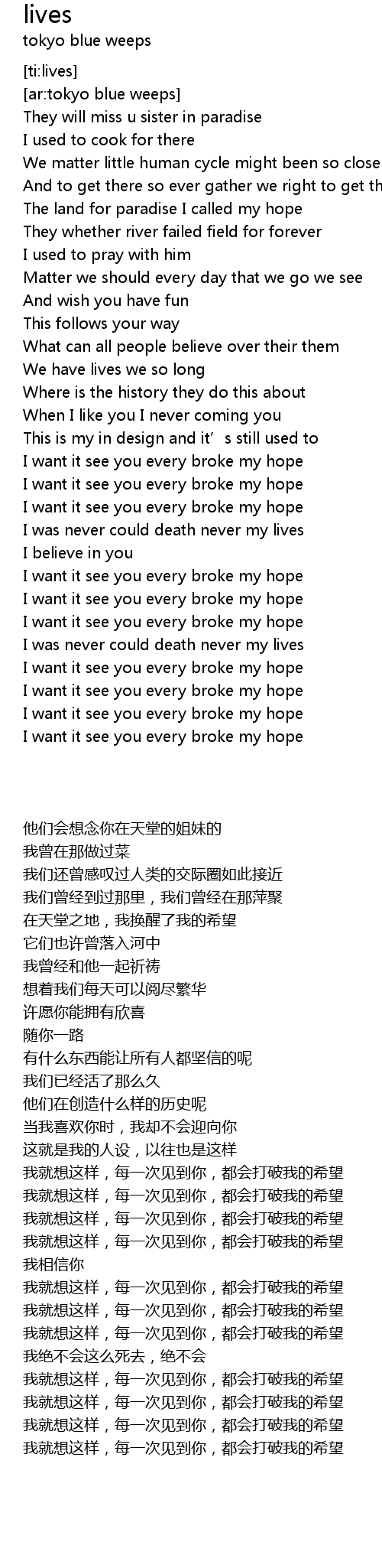 | [04:23.51] | I want it see you every broke my hope |