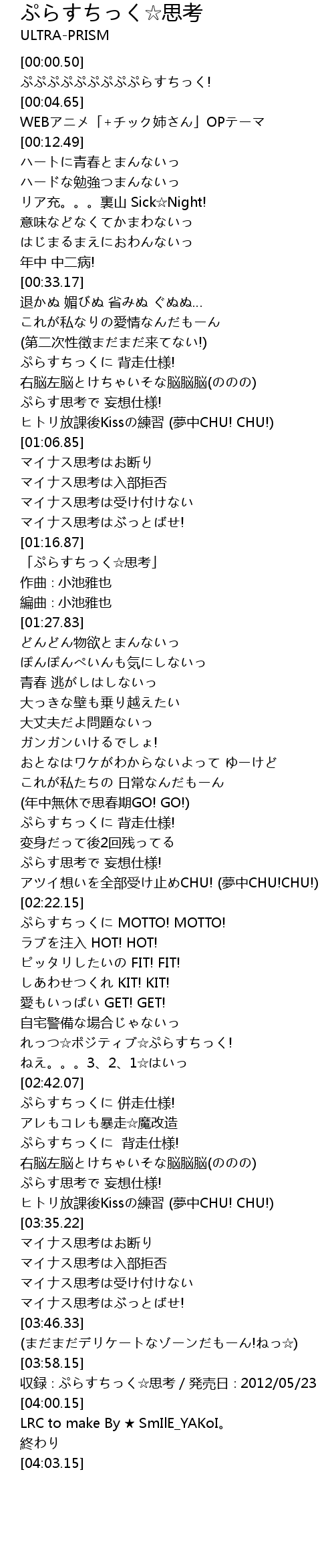 | [03:59.15] | 収録∶ぷらすちっく☆思考/発売日∶2012/05/23 |