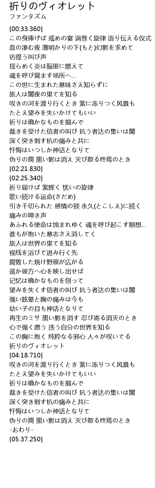 | [04:06.820] | この胸に抱く 纯粋なる邪心 人々が叹いてる 祈りのヴィオレット |