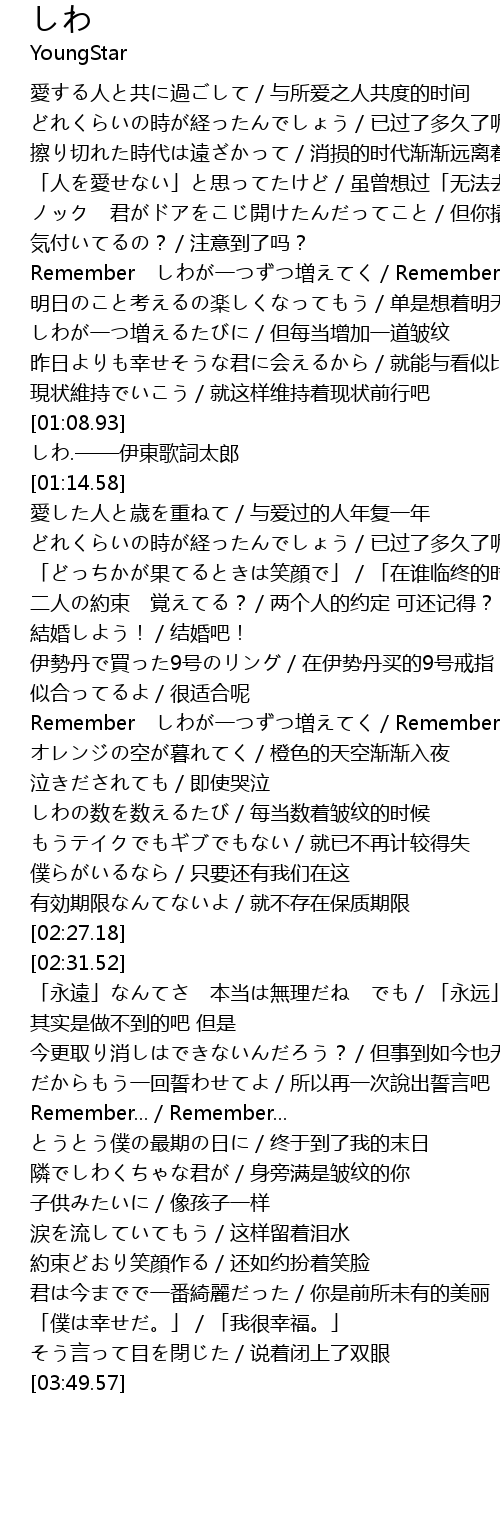 | [01:47.07] | Remember しわが一つずつ増えてく/Remember 皱纹一道道增加着 |