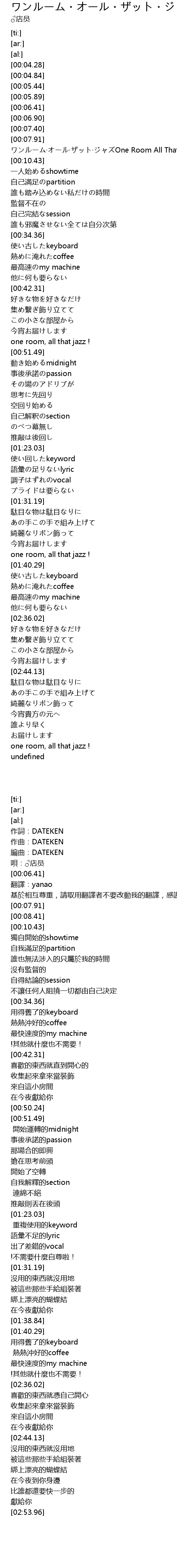 | [00:08.41] | ワンルーム·オール·ザット·ジャズOne Room All That Jazz |