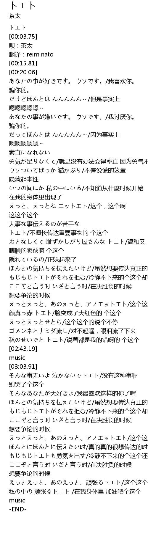 | [01:23.73] | 大事な事伝えるのが苦手な トエト/不擅长传达重要事物的 个这个 |