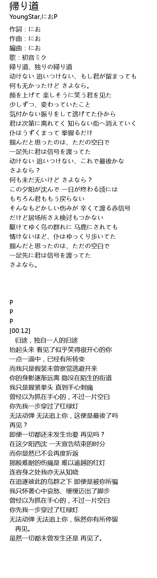 | [04:15.9] | 我只怀著心中哀愁、缓缓迈出了脚步 |