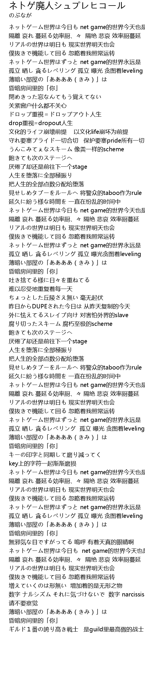 | [03:00.97] | 孤立 晒し 貪るレベリング 孤立 曝光 贪图着leveling |