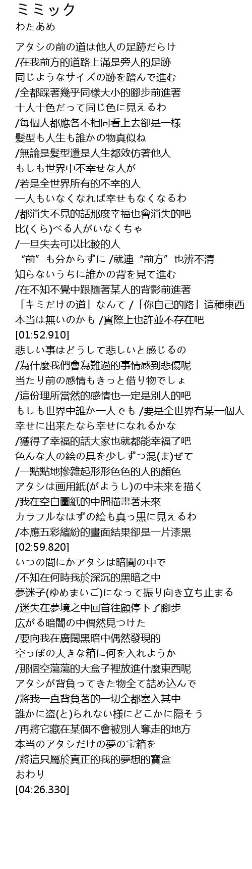 | [02:08.820] | 当たり前の感情もきっと借り物でしょ /這份理所當然的感情也一定是別人的吧 |
