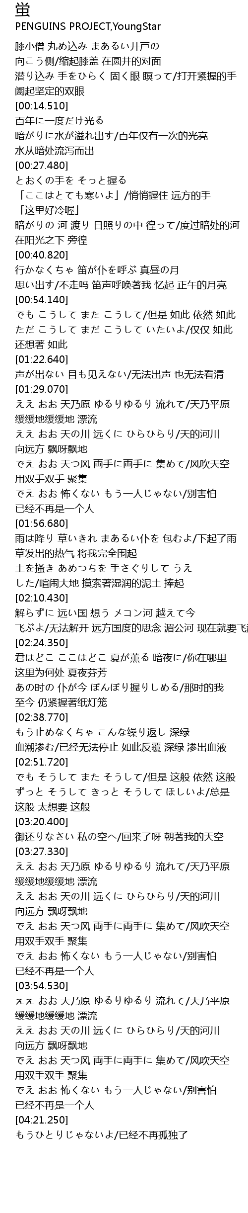 | [01:36.270] | ええ おお 天の川 远くに ひらひらり/天的河川 向远方 飘呀飘地 |