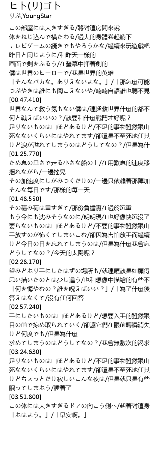 | [02:02.560] | 要らないものは山ほどあるけど/不要的事物雖然跟山一樣多 |