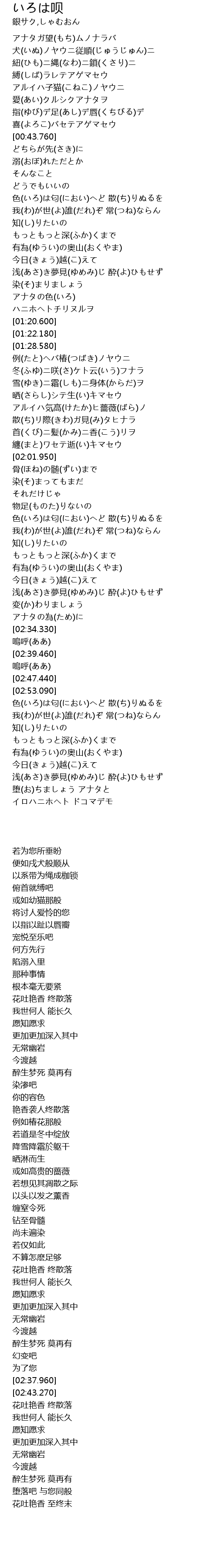 | [02:12.860] | 色(いろ)は匂(におい)へど 散(ち)りぬるを |