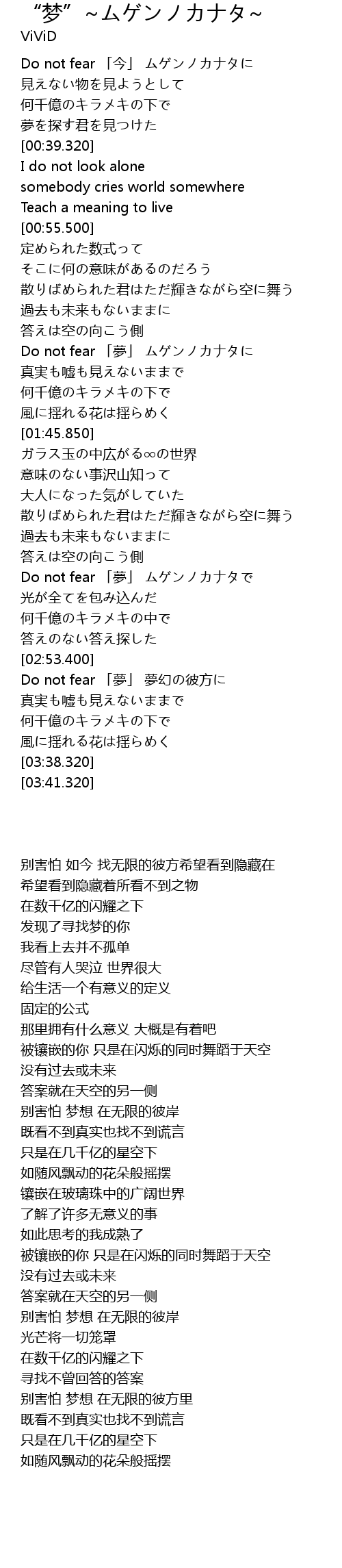 | [02:27.380] | Do not fear 「夢」 ムゲンノカナタで |