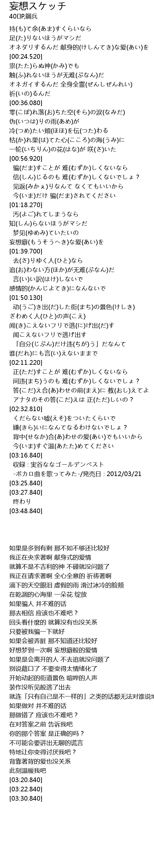 | [01:34.240] | 梦见(ゆめみ)ていたいの 妄想癖(もうそうへき)な爱(あい)を |
