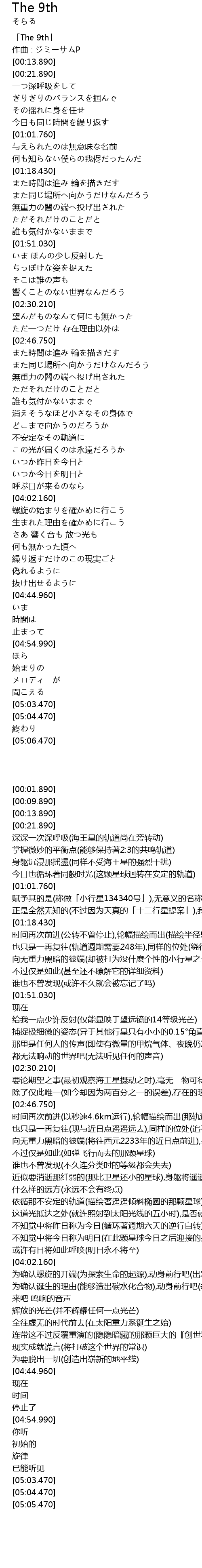| [01:33.290] | 向无重力黑暗的彼端(却被打为没什麽个性的小行星之一,投身而去(遭到降格的那颗星球) |