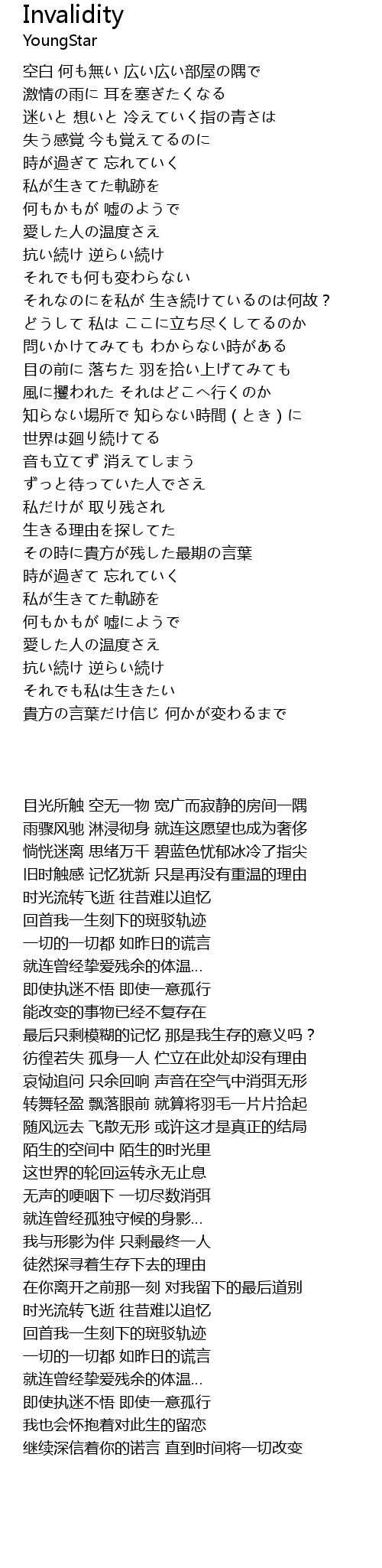 | [02:36.40] | 彷徨若失 孤身一人 伫立在此处却没有理由 |