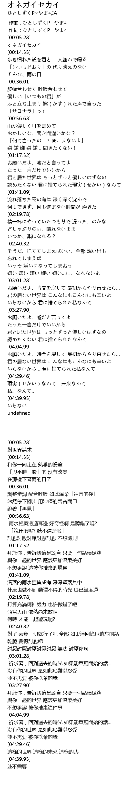 | [00:05.98] | オネガイセカイ |