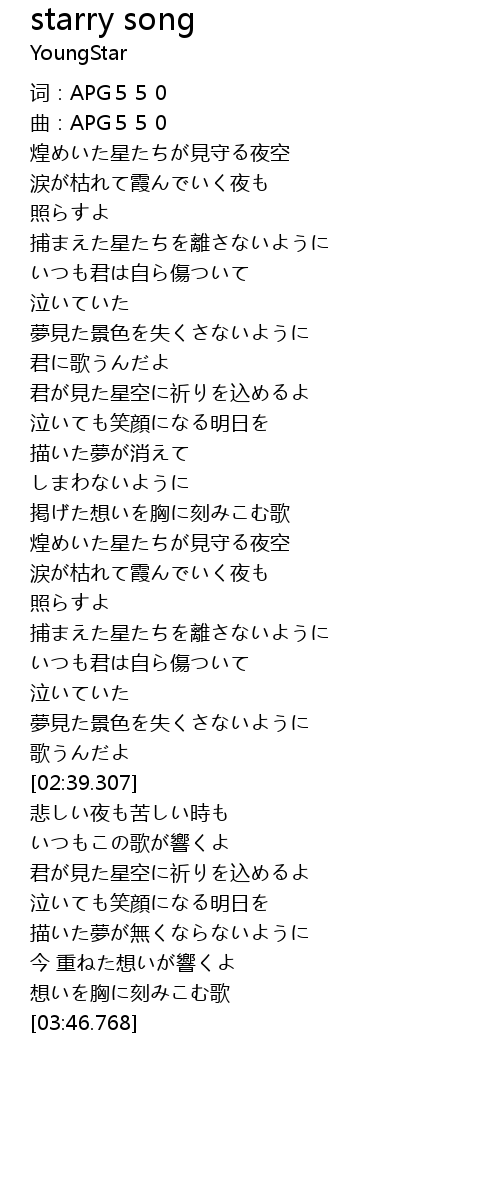 | [01:46.587] | 煌めいた星たちが見守る夜空 |