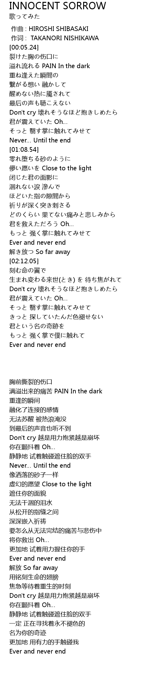 | [00:43.87] | Don't cry 越是用力抱紧越是崩坏 |