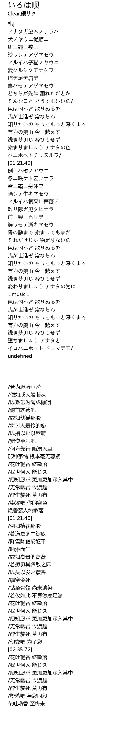 | [02:13.00] | 色は匂へど 散りぬるを |