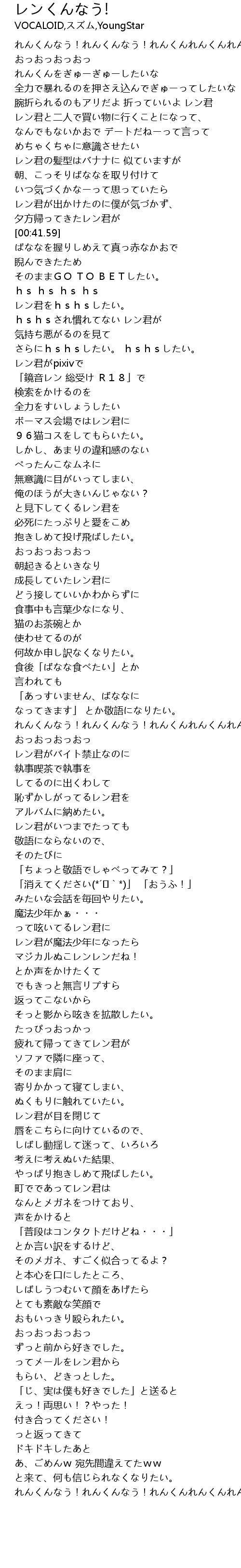 | [01:32.28] | れんくんなう!れんくんなう!れんくんれんくんれんくんなう!×8 |