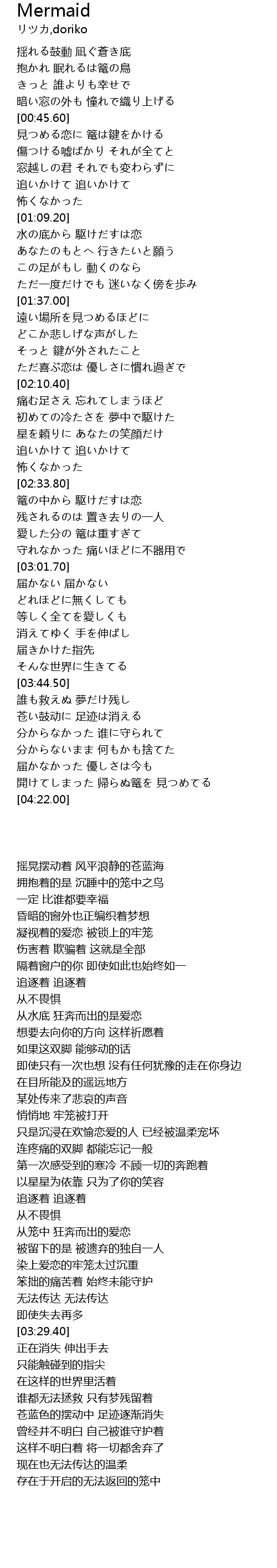 | [00:46.10] | 凝视着的爱恋 被锁上的牢笼 |