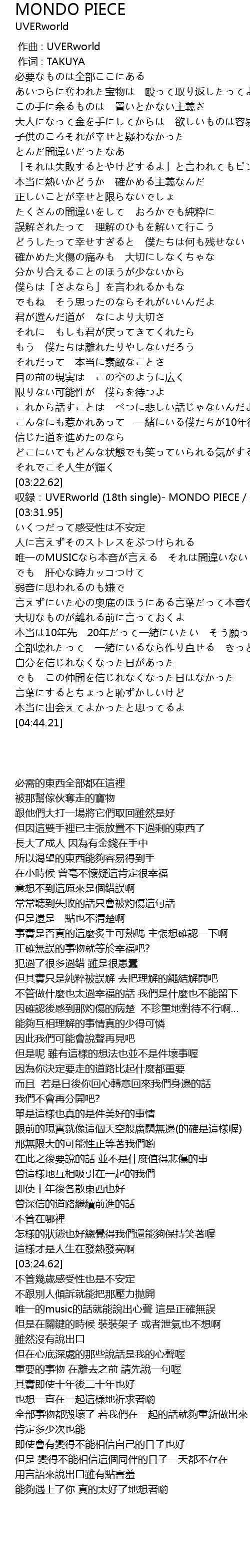 | [03:24.62] | shou lu: UVERworld 18th single MONDO PIECE fa mai ri: 2011 04 06 |