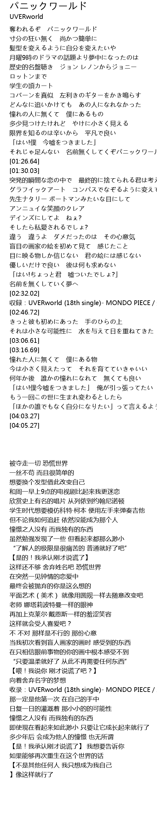 | [02:39.02] | 收录:UVERworld (18th single)- MONDO PIECE/发售日:2011/04/06 |
