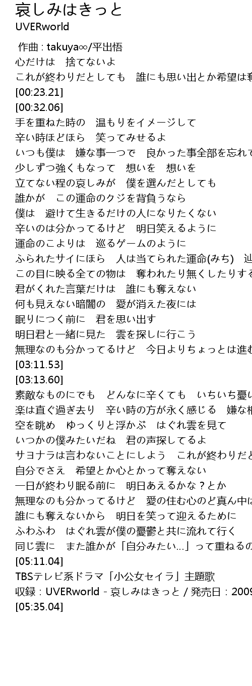 | [05:18.04] | 収録:UVERworld - 哀しみはきっと/発売日:2009/10/28 |