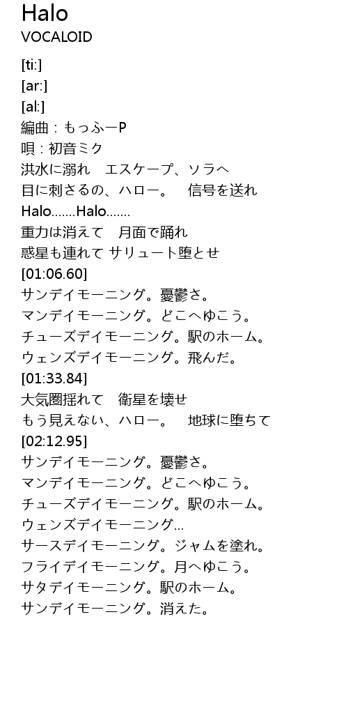 | [02:03.24] | もう見えない、ハロー。 地球に堕ちて |