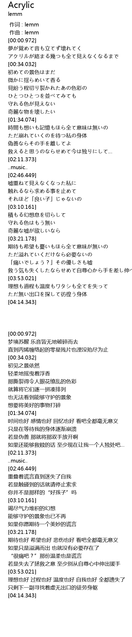 | [03:53.355] | 理想も過程も温度もワタシも全てを失って |