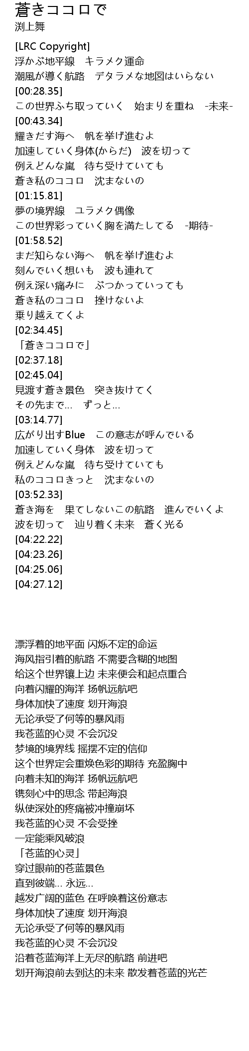| [04:06.98] | 波を切って 辿り着く未来 蒼く光る |
