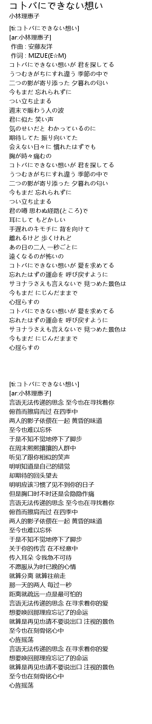 | [00:15.55] | コトバにできない想いが 君を探してる |