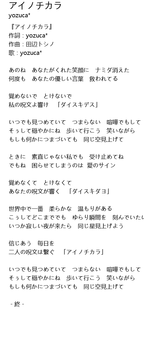 | [03:14.84] | 二人の呪文は繋ぐ 「アイノチカラ」 |