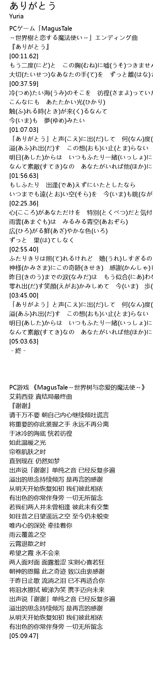 | [00:01.62] | PCゲーム「MagusTale ~世界樹と恋する魔法使い~」エンディング曲 |