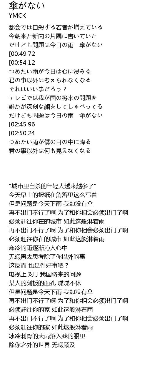 | [00:39.42] | だけども問題は今日の雨 傘がない |