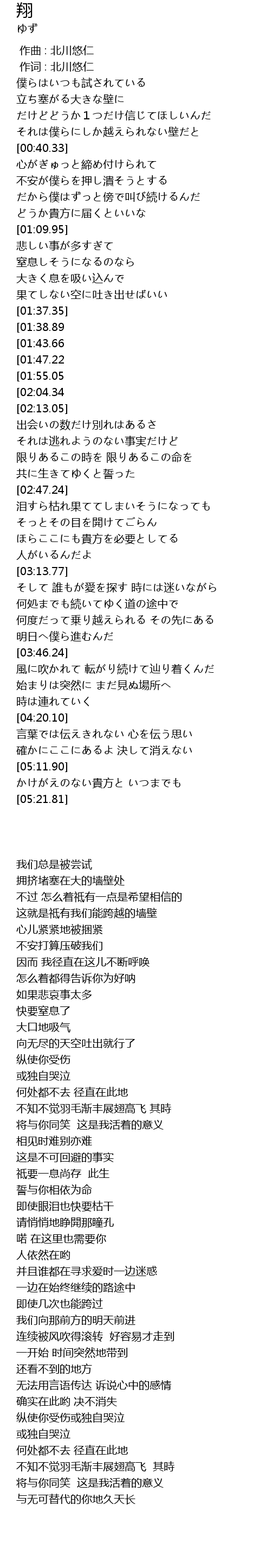 | [04:53.69][01:55.05] | いつの日か翼広げ 羽ばたくその時 |