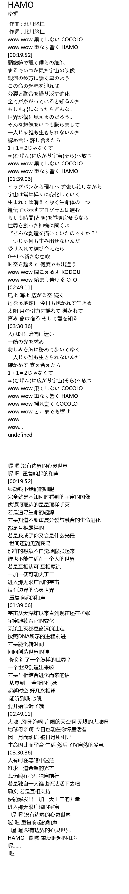 | [00:12.95] | wow wow 重なり響く HAMO |