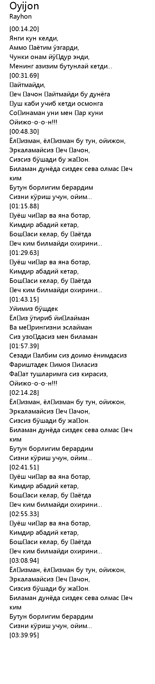 Ёлғизман, ёлғизман бу тун, ойижон, |