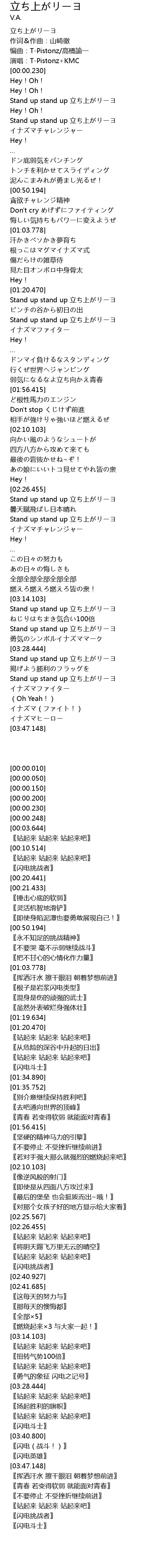 | [03:35.184] | Stand up stand up 立ち上がリーヨ |
