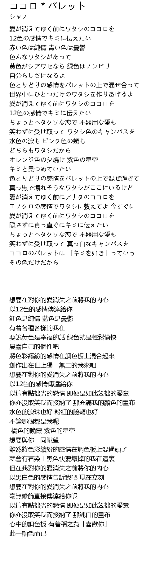 | [01:13.78] | 12色の感情でキミに伝えたい |