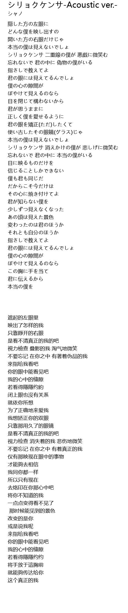 | [00:32.27] | シリョクケンサ 二重線の僕が 悪戯に微笑む |
