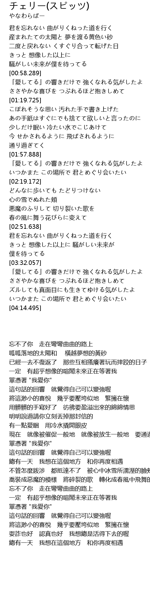 | [02:36.884] | 悪魔のふりして 切り裂いた歌を 春の風に舞う花びらに変えて |