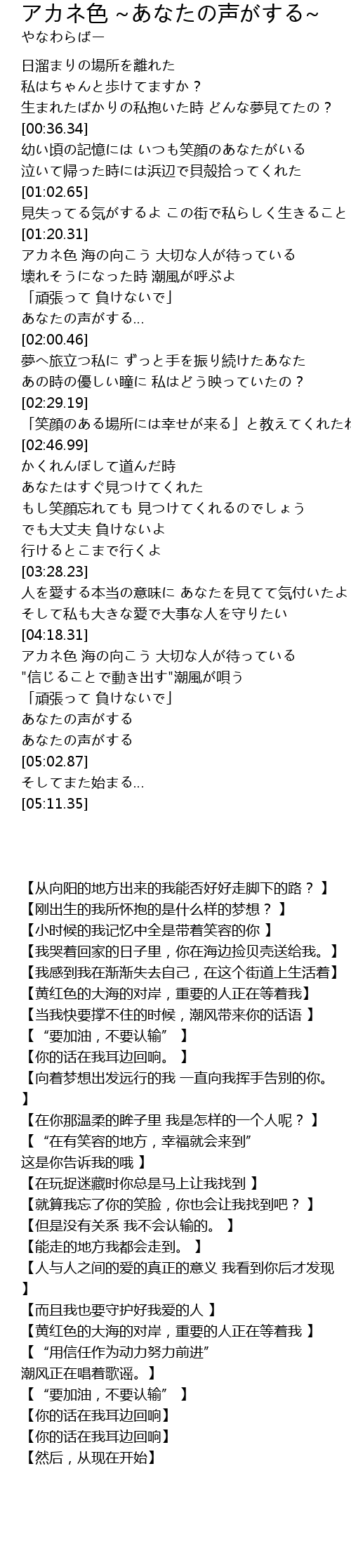 | [04:19.36] | アカネ色 海の向こう 大切な人が待っている |