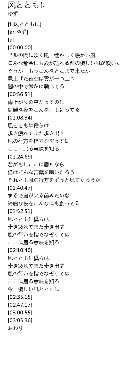 | [00:25.06] | ビルの間に吹く風 懐かしく暖かい風 |