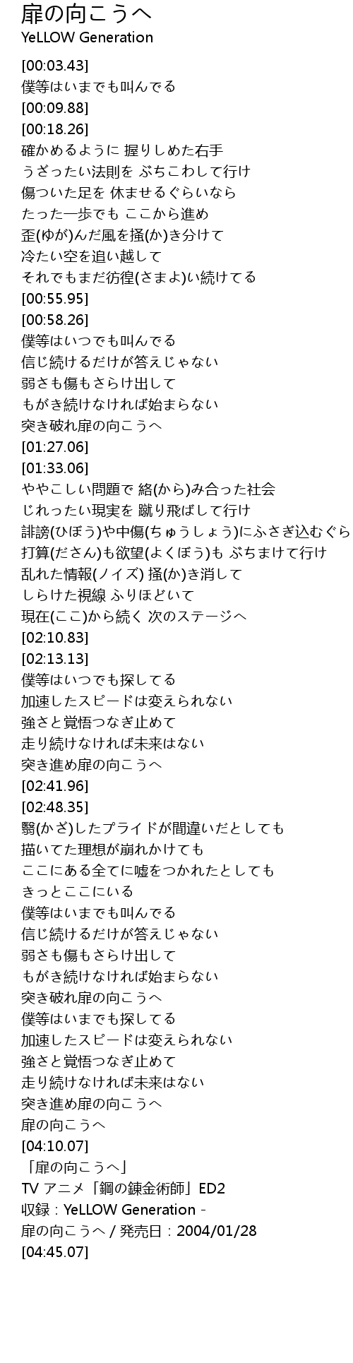 | [04:22.07] | 収録:YeLLOW Generation - 扉の向こうへ/発売日:2004/01/28 |