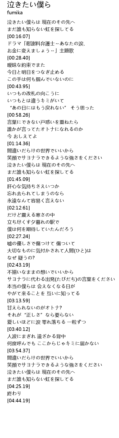 | [04:09.24] | 泣きたい僕らは 現在のその先へ |