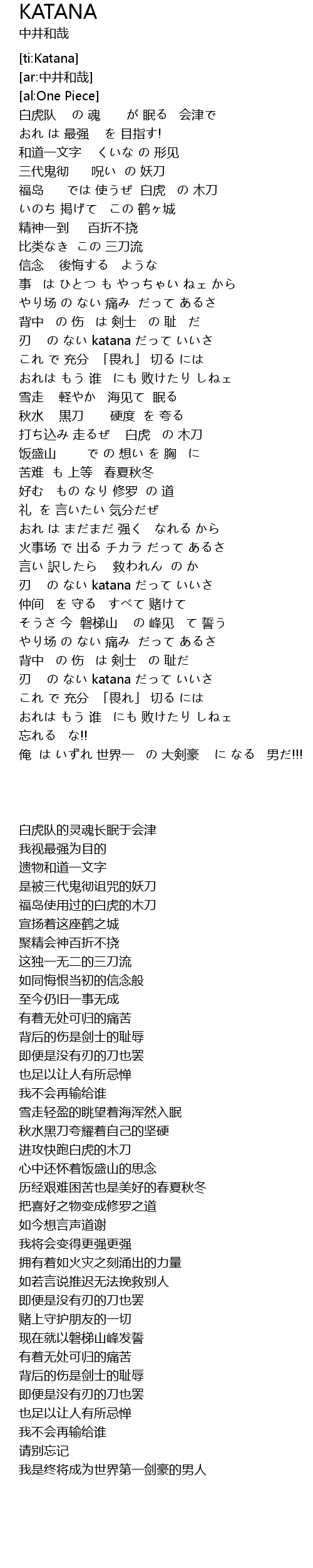 | [03:43.21] | 我是终将成为世界第一剑豪的男人 |