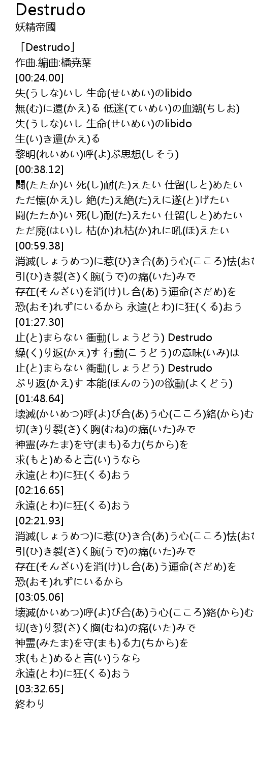 | [01:43.59] | 止(と)まらない 衝動(しょうどう) Destrudo |